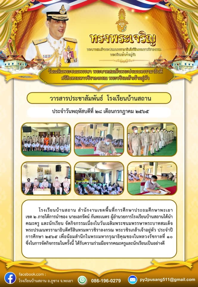 โรงเรียนบ้านสถาน สำนักงานเขตพื้นที่การศึกษาประถมศึกษาพะเยา เขต 2 ภายใต้การนำของ นายเอกรัตน์ กันทะเนตร ผู้อำนวยการโรงเรียนบ้านสถาน ได้นำคณะครู และนักเรียน จัดกิจกรรมเนื่องในวันเฉลิมพระชนมพรรษาพระบาทสมเด็จพระปรเมนทรรามาธิบดีศรีสินทรมหาวชิราลงกรณ พระวชิรเกล้าเจ้าอยู่หัว ประจำปีการศึกษา ๒๕๖๕ เพื่อน้อมสำนึกในพระมหากรุณาธิคุณของในหลวงรัชกาลที่ ๑๐